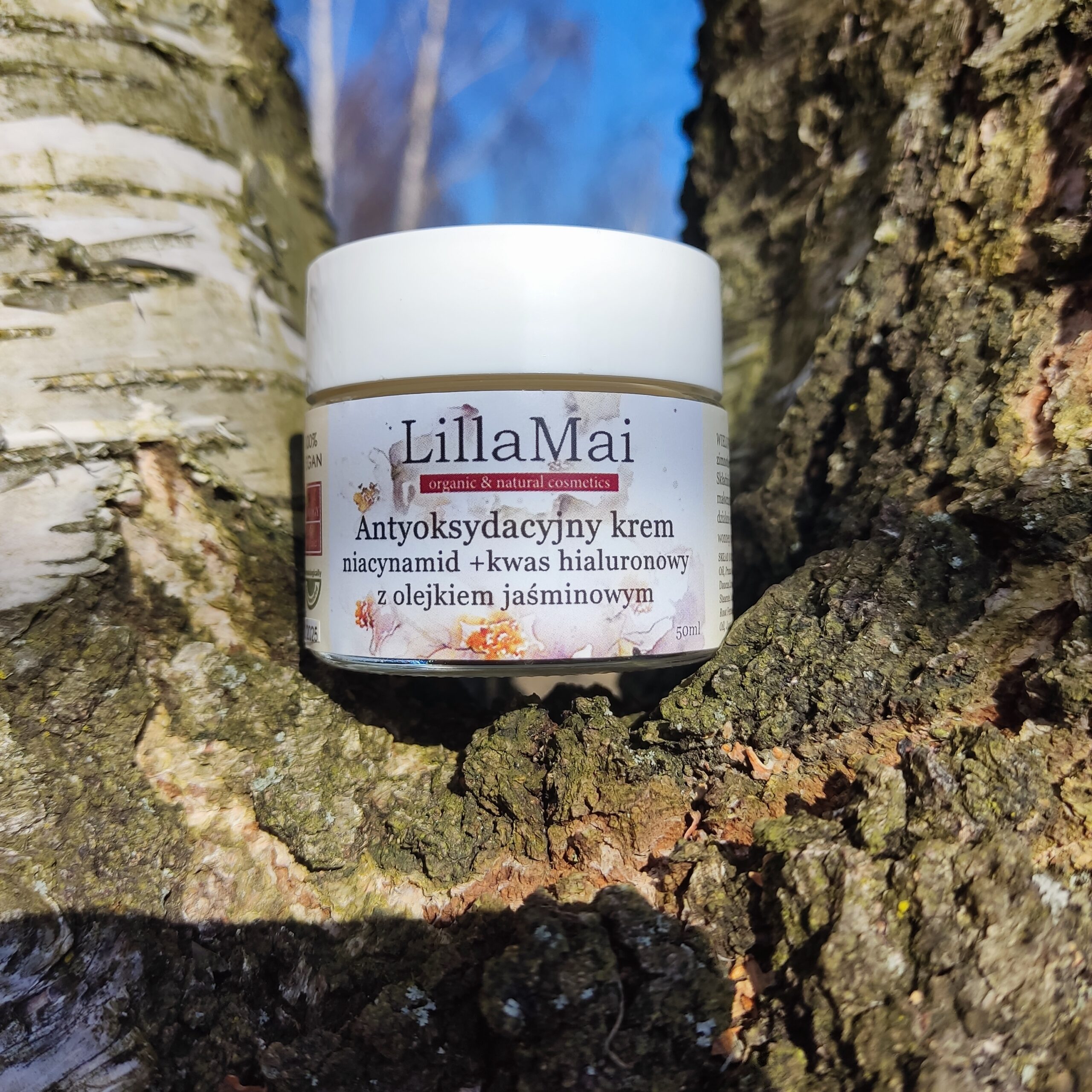 Przekazuje w Wasze ręce starannie dopracowany antyoksydacyjny krem z niacynamidem i kwasem hialuronowym o zapachu jaśminu. Pojemność 50g. Opakowanie szklane. Krem jest WIELOFUNKCYJNY i może być użyty do każdego rodzaju cery:problematycznej,naczynkowej, trądzikowej,atopowej,suchej,dojrzałej, tłustej,mieszanej,wrażliwej. Składnikami wiodącymi kremu jest NIACYNAMID i KWAS HIALURONOWY MAŁOCZĄSTECZKOWY. Połączenie ich obu jest bardzo korzystne i wzmacnia wspólne działanie. Dodatkowo w kremie znajdziecie BIOFERMENT Z ACEROLI i SKWALAN;składniki aktywne. Naturalny OLEJEK JAŚMINOWY ukoi zmysły pięknym, łagodnym zapachem. Dzięki dobranym olejom zimnotłoczonym, nierafinowanym z nasion lnu, wiesiołka, słodkich migdałów, arbuza,nasion marchwi,kokosa oraz mieszance ziół z upraw ekologicznych, w skład której wchodzi BABKA LANCETOWATA, NAGIETEK, PRZYWROTNIK, RUMIANEK ten krem zapewnia działanie: -PRZECIWUTLENIAJĄCE głównie dzięki niacynamidowi czyli witaminie B3,której w kremie jest stężenie 2%. Taką funkcje w kremie pełni również olej lniany i bioferment z aceroli. -REGULUJĄCE produkcję sebum, ponieważ niacynamid reguluje pracę gruczołów łojowych, dzięki czemu zmniejszeniu ulega nadprodukcja sebum oraz nadmierne przetłuszczanie się cery. Niacynamid wzmacnia barierę hydrolipidową skóry. -MOCNO NAWILŻAJĄCE dzięki małocząsteczkowemu kwasowi hialuronowemu, który głębiej wnika w skórę niż wielkocząsteczkowy, i dzięki temu wiąże wodę w głębszych partiach skóry podnosząc jej nawilżenie. Zewnętrznie objawi się to jako efekt wypełnienia i młodszego wyglądu. Skóra staje się bardziej miękka,jędrna i sprężysta. - ŁAGODZĄCE podrażnienia,sprzyja gojeniu się ran i blizn,działa przeciwzapalnie, zwęża pory. Kosmetyki z niacynamidem mogą bezpiecznie stosować kobiety w ciąży. BIOFERMENT Z ACEROLI jest bogatym źródłem witaminy C, antocyjanów, witaminy A i karotenoidów. Fermentacja dzięki bakteriom kwasu mlekowego polepszyła przyswajalność. Bioferment rozjaśnia skórę, działa przeciwutleniająco, przeciwzapalnie, nawilżająco, wygładzająco. SKWALAN Z TRZCINY CUKROWEJ Skwalen jest składnikiem ludzkiego sebum (12-13%) oraz znajduje się w przestrzeni międzykomórkowej. Ponieważ skwalen jest substancją nietrwałą, metodą fermentacji otrzymywany jest skwalan o podobnej strukturze do skwalenu, lecz trwały i zgodny ze skórą ludzką. Ma działąnie nawilżające, regenerujące, ochronne. PROPANEDIOL: pomaga wniknąć składnikom bardziej w skórę, w szczególności rozpuszcza kwasy.